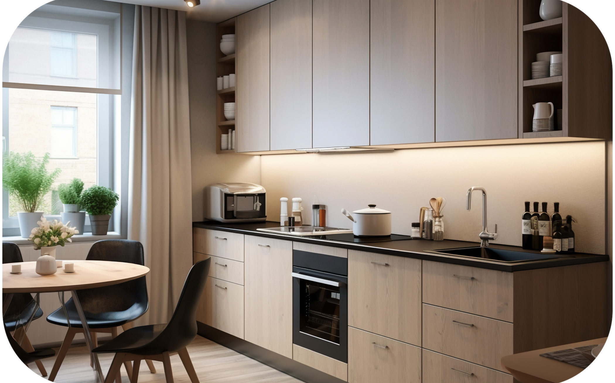 Делаем кухни и корпусную мебель из европейских материалов с которыми кухню не придется менять через 5 лет. Фурнитура будет ходить как новая. Столешница не потрескается, даже если вы очень любите готовить.